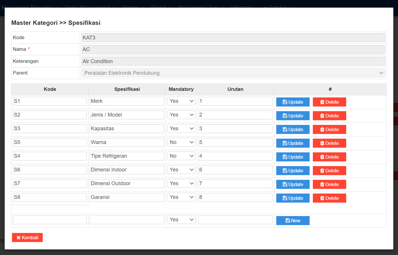 Halaman Daftar Spesifikasi Kategori