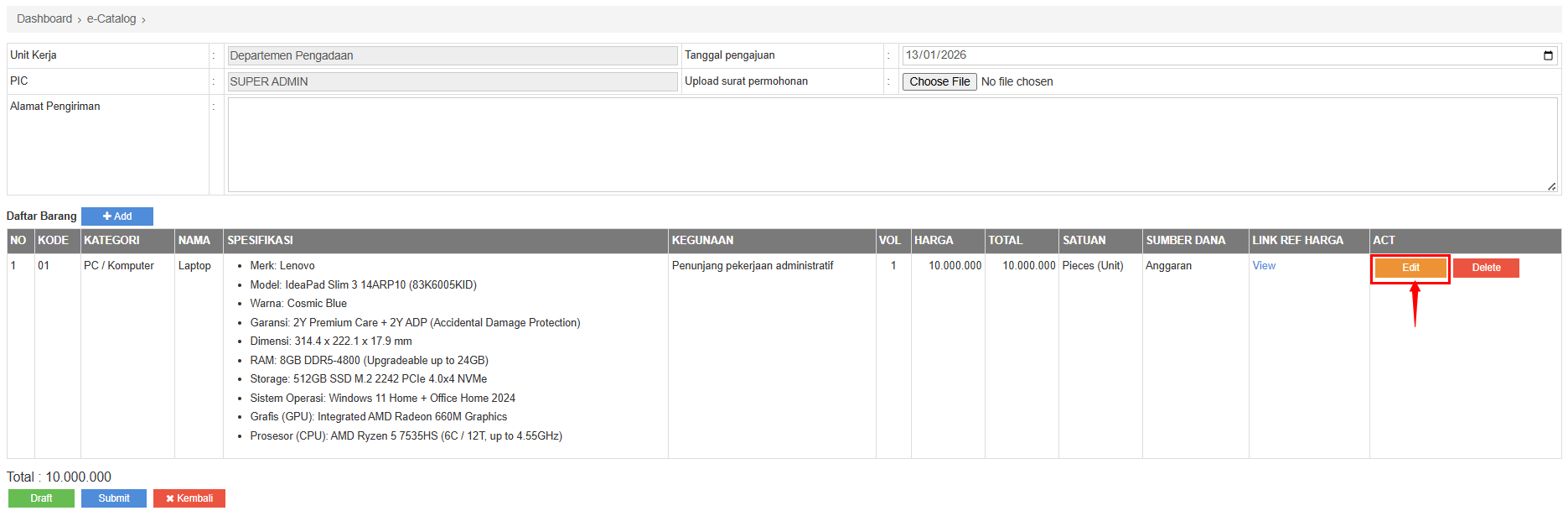 Tombol edit item kebutuhan barang